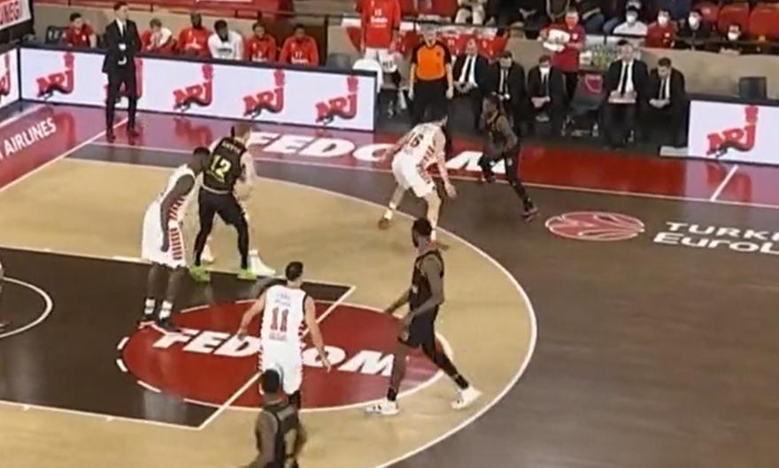 Ο άσος της Μονακό πέτυχε εντυπωσιακό καλάθι τριών πόντων με σουτ δίχως ισορροπίας, κερδίζοντας και βολή από την άμυνα του Παπανικολάου.