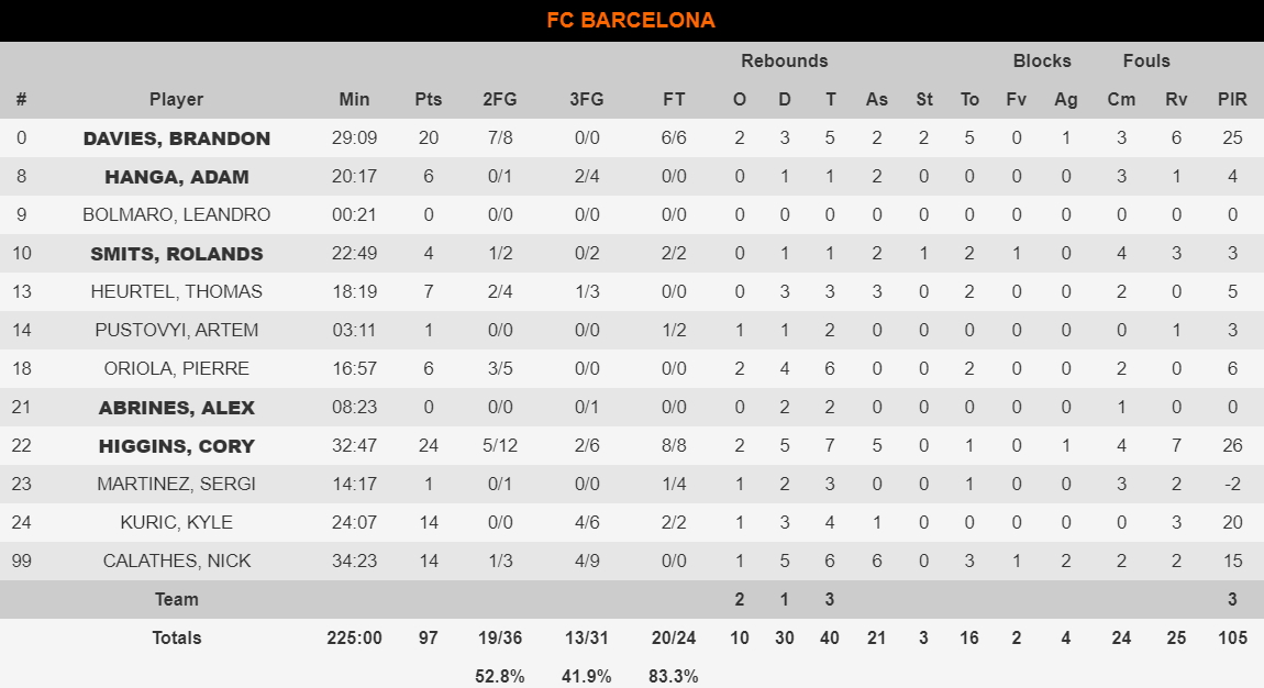 Μπαρτσελόνα (Γιασικεβίτσιους): Ερτέλ 7, Καλάθης 14 (6 ριμπ., 6 ασίστ), Μαρτίνεθ 1, Κούριτς 14 (4/6 τρ.), Χίγκινς 24 (7 ριμπ., 5 ασίστ), Αμπρίνες, Μπολμάρο, Χάνγκα 6, Σμιτς 4, Οριόλα 6 (6 ριμπ.), Ντέιβις 20 (7/8 δίποντα), Πουστοβόι 1