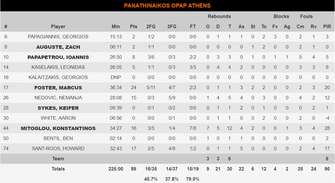 Παναθηναϊκός (Βόβορας): Σάικς, Σαντ-Ρος 17 (5 ασίστ), Καλαϊτζάκης, Νέντοβιτς 15 (5 ριμπ., 4 ασίστ), Φόστερ 24, Παπαπέτρου 8, Κασελάκης 5, Γουάιτ, Μήτογλου 16 (12 ριμπ.), Παπαγιάννης 2, Μπέντιλ, Όγκαστ 2
