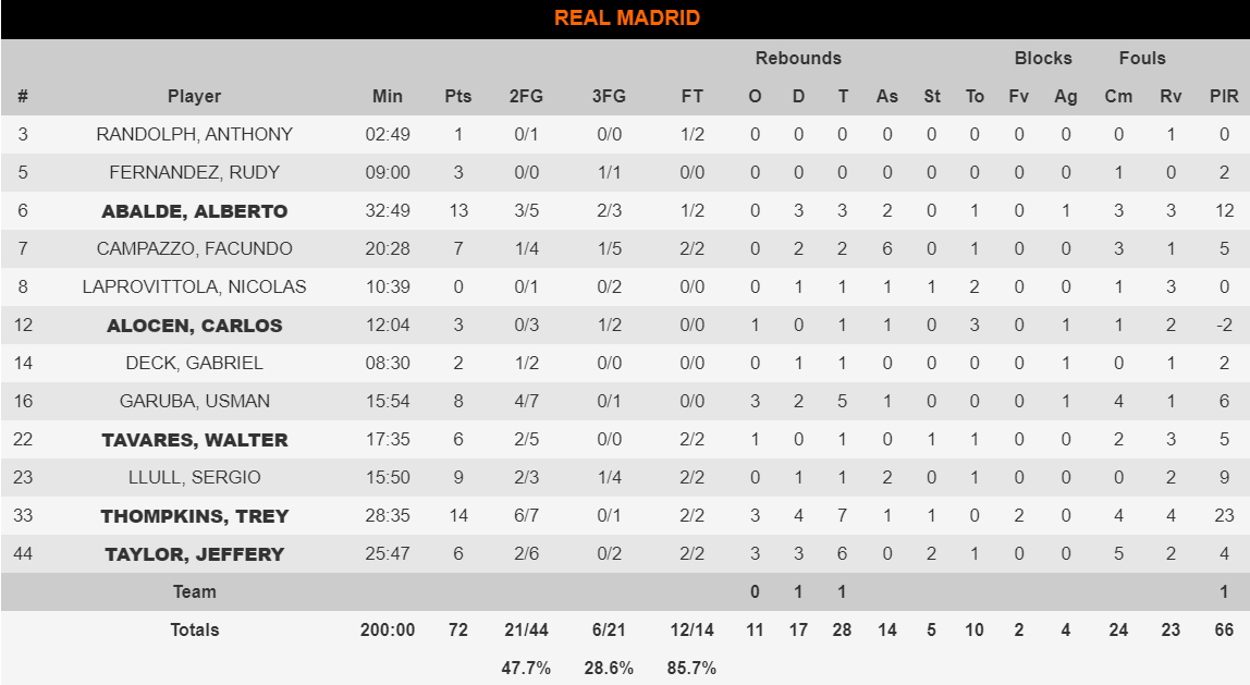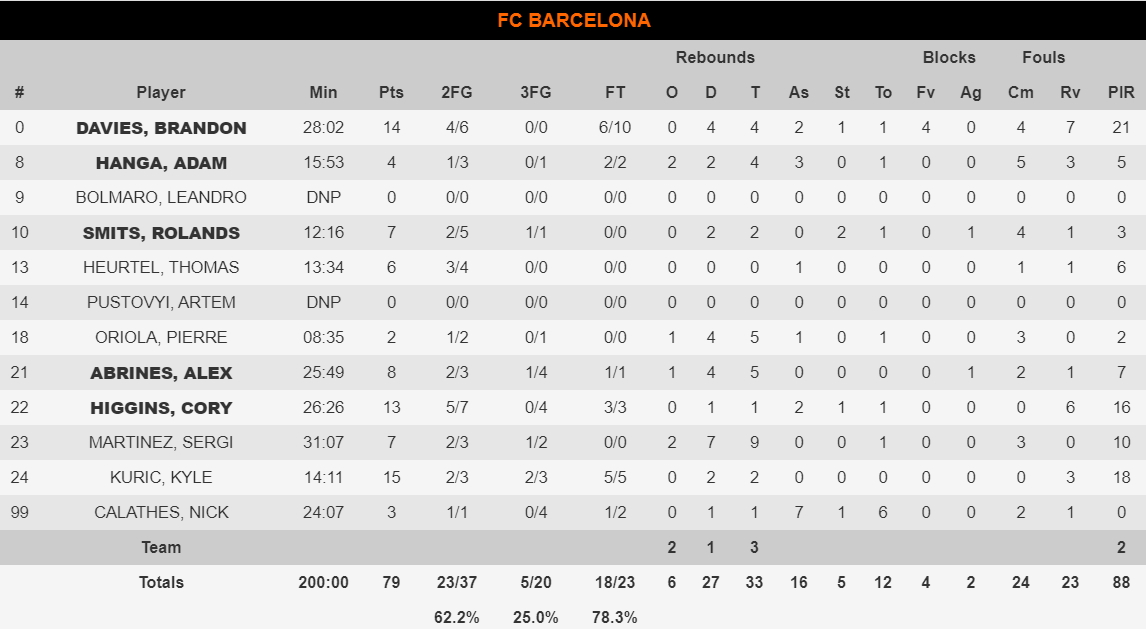 Πρωταγωνιστές για την ομάδα του Γιασικεβίτσιους οι Ντέιβις (14 πόντοι), Κούριτς (15 πόντοι), Χίγκινς (13 πόντοι) και ο νεαρός Μαρτίνεθ (7 πόντοι, 9 ριμπάουντ). Στο 4-1 ανέβηκαν οι Καταλανοί, που ισοβαθμούν με Ζαλγκίρις και Μπάγερν Μονάχου στην κορυφή της βαθμολογίας.