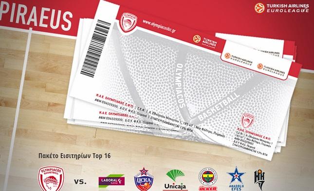 Η Διεύθυνση Εισιτηρίων της Κ.Α.Ε. ΟΛΥΜΠΙΑΚΟΣ ανακοινώνει ότι από την Τρίτη 13/01/2015 θα κυκλοφορήσει μέσω του www.olympiacosbc.gr καθώς επίσης και από τα γραφεία της Κ.Α.Ε. ΟΛΥΜΠΙΑΚΟΣ στο ΣΕΦ, περιορισμένος αριθμός πακέτων εισιτηρίων για τους έξι (6) εντός έδρας αγώνες του ΤΟΡ 16 της Euroleague.