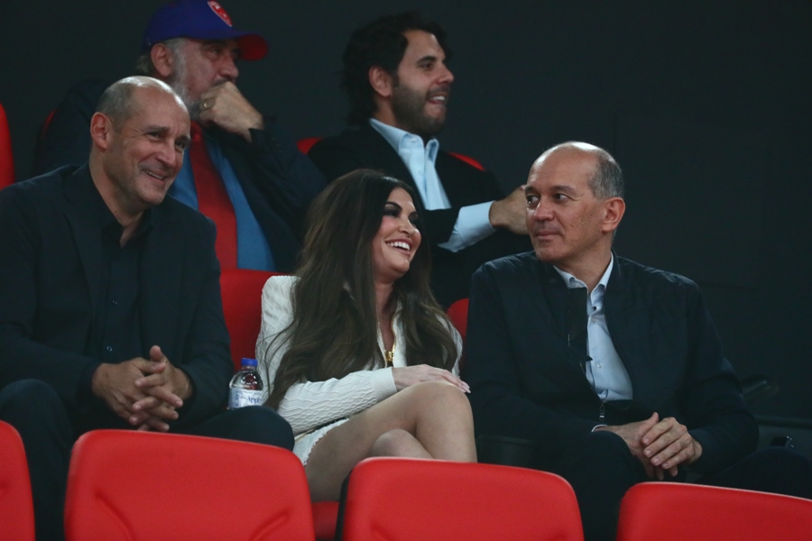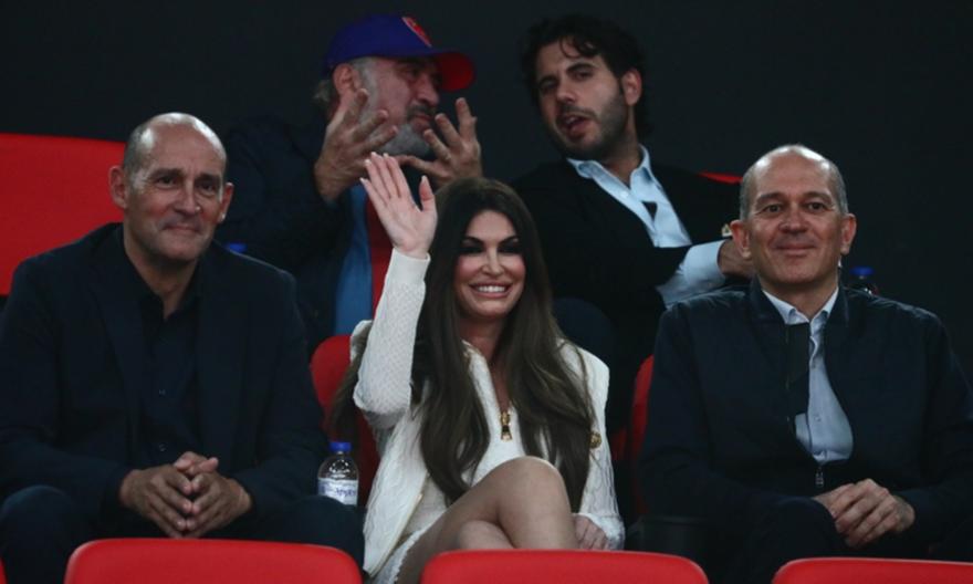 Η Πρέσβειρα των ΗΠΑ προσκλήθηκε από την «ερυθρόλευκη» ΚΑΕ στο παιχνίδι και κάθεται στα επίσημα μαζί με τους Παναγιώτη και Γιώργο Αγγελόπουλο.