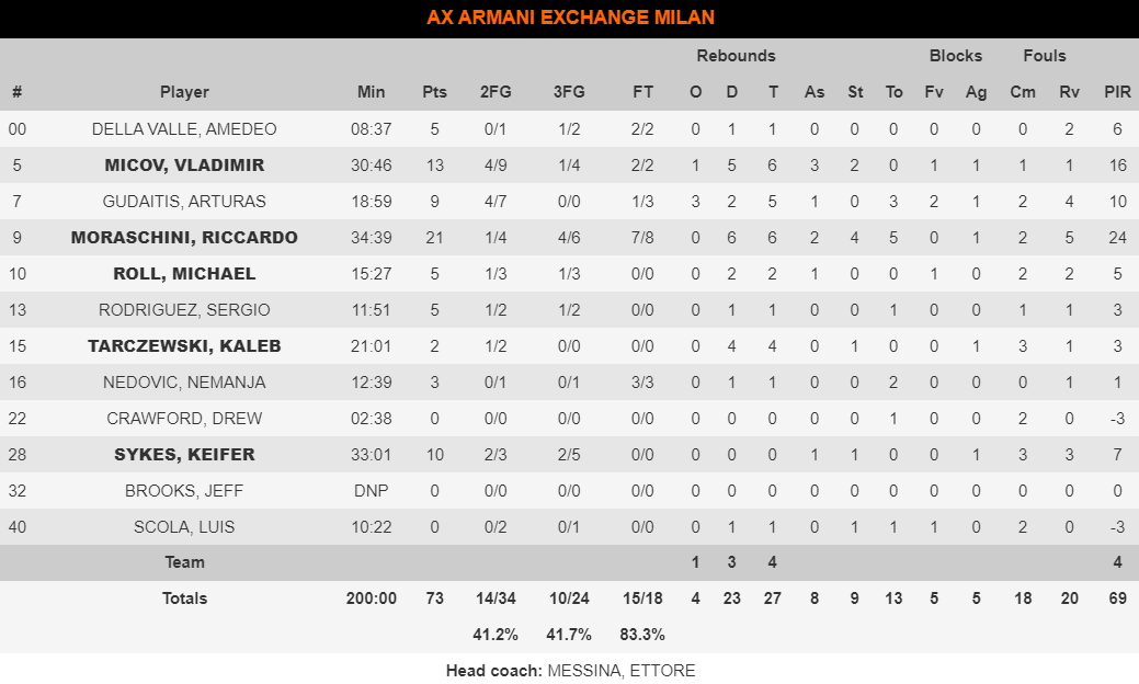 Από την άλλη, οι Ιταλοί υποχώρησαν στο 11-16, υπέστησαν την 5η σερί ήττα τους και 8η στα 9 τελευταία. Μορασκίνι (21 πόντοι, 6 ριμπάουντ, 4 κλεψίματα) και Μίτσοβ (13 πόντοι, 6 ριμπάουντ) διασώθηκαν από την ομάδα του Μεσίνα, αν και ο δεύτερος στάθηκε μοιραίος αφού έχασε τρίποντο ισοφάρισης στο φινάλε.