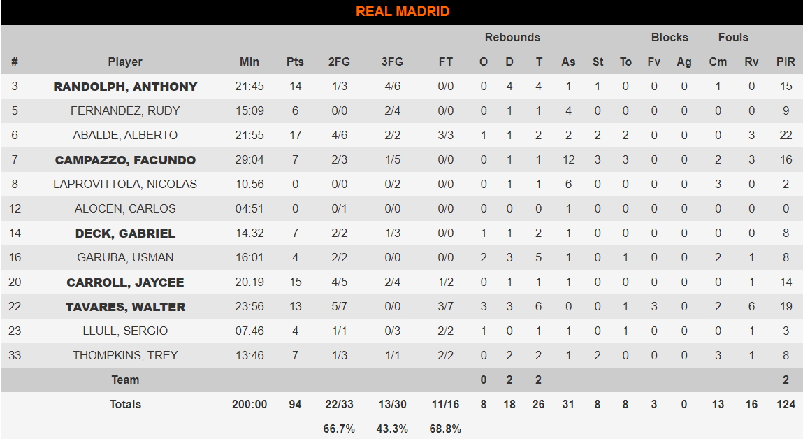 Η ομάδα του Λάσο πανηγύρισε την 5η σερί νίκη της και ανέβηκε στο 6-4. Αμπάλδε (17 πόντοι), Ράντολφ (14 πόντοι, 4 ριμπαόυντ) και Ταβάρες (13 πόντοι, 6 ριμπάουντ) ξεχώρισαν για τους νικητές, με τον Καμπάτσο να προσθέτει 7 πόντους και 12 ασίστ στο πιθανότατα τελευταίο παιχνίδι του με τη φανέλα της «βασίλισσας».