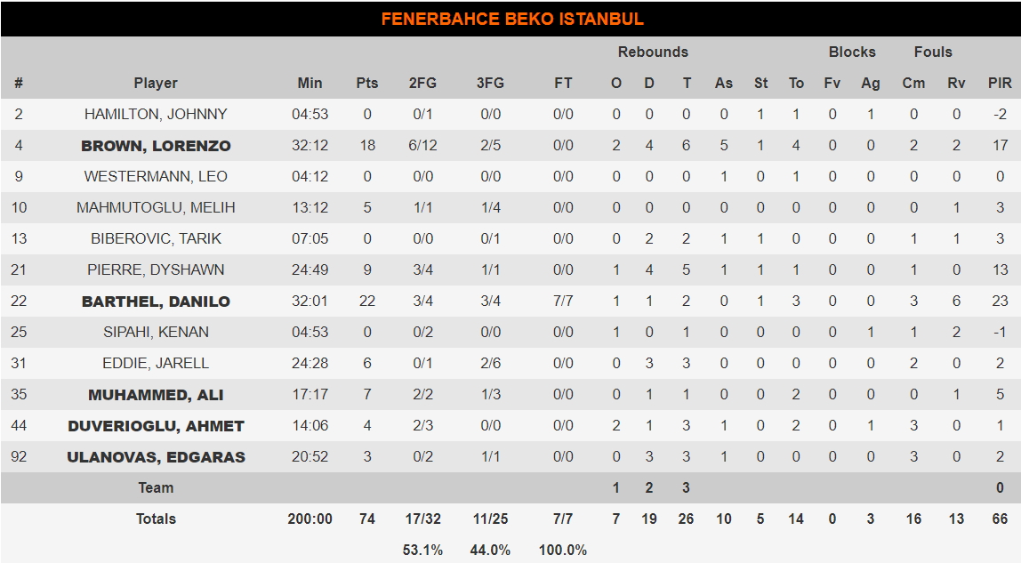 Από την άλλη, η Φενέρ υπέστη την 3η διαδοχική ήττα της και υποχώρησε στο 4-6. Μπάρτελ (22 πόντοι) και Μπράουν (18 πόντοι, 6 ριμπάουντ, 5 ασίστ) διασώθηκαν από το «ναυάγιο» των φιλοξενούμενων.