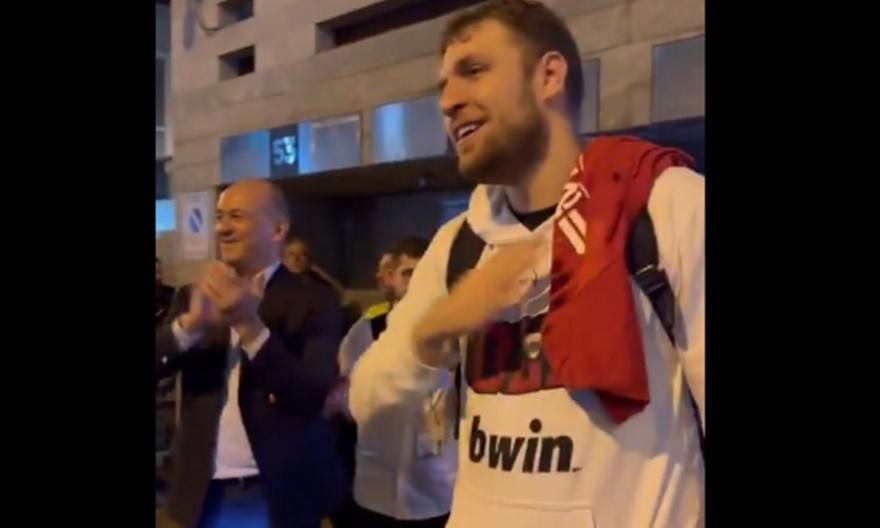 The Presidents of Olympiacos BC, Panayotis and Georgios Angelopoulos, along with Sasha Vezenkov, were cheered by the fans waiting for the team outside the Movistar Arena in Madrid.#OlympiacosBC #WeAreOlympiacos #TogetherWeFight pic.twitter.com/2dC9P5jxqG