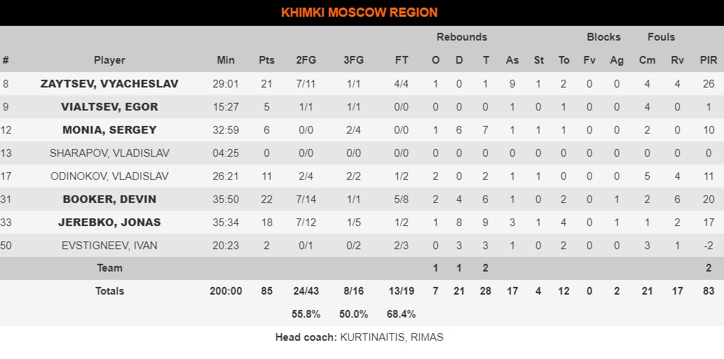 Κορυφαίοι για τους γηπεδούχους ήταν ο Σέρχιο Γιουλ με 21 πόντους, ο Νικολάς Λαπροβίτολα με 19 πόντους κι 7 ασίστ, ενώ 18 πόντους είχε ο Τρέι Τόμπκινς. Για την ομάδα του Ρίμας Κουρτινάιτις, που παρατάχθηκε χωρίς τους θετικούς στον κορωνοϊό Τίμα, Βορόνοφ, Μίκι, Μονρό και Μπαράσκοφ, καθώς και τους τραυματίες Σβεντ και Γιόβιτς, ξεχώρισε ο Ντέβιν Μπούκερ με 21 πόντους αλλά πλέον έφτασε στο 0-3.