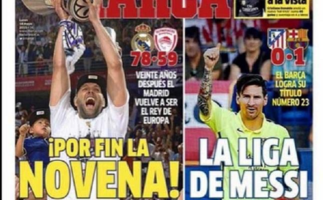 Το πρωτοσέλιδο της «Marca» είναι χωρισμένο στη μέση. Αναφέρεται στην κατάκτηση του ευρωπαϊκού τροπαίου μετά από 20χρόνια και 9ο στο θεσμό, ενώ στα δεξιά κάνει λόγο «για το πρωτάθλημα του Μέσι» και το γεγονός ότι η Μπαρτσελόνα έφτασε 23 πρωταθλήματα στην ιστορία της.