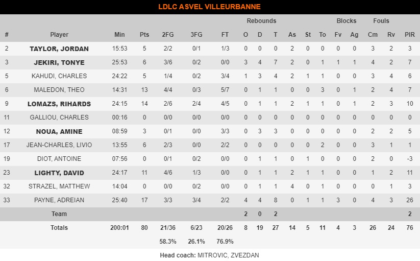 Παρόμοια ήταν η εικόνα και στη δεύτερη περίοδο, αφού η Βιλερμπάν κράτησε σταθερά σε διψήφιους αριθμούς τη διαφορά, με τον Πέιν να κάνει το 44-27 στα 2:30 πριν το τέλος, ενώ ο Μαλεντόν έκανε το 49-28 με δύο βολές. Ο Γιοβάνοβιτς μείωσε λίγο πριν το τέλος με δίποντο.