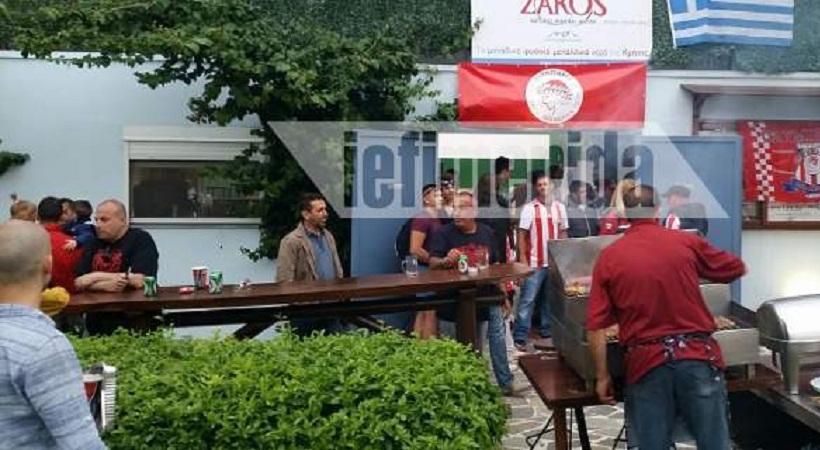 Φυσικά από τη μεγάλη τους γιορτή ενόψει τελικού δεν λείπουν οι μπύρες και τα σουβλάκια, με τους φίλους του Ολυμπιακού να έχουν στήσει ψησταριά.