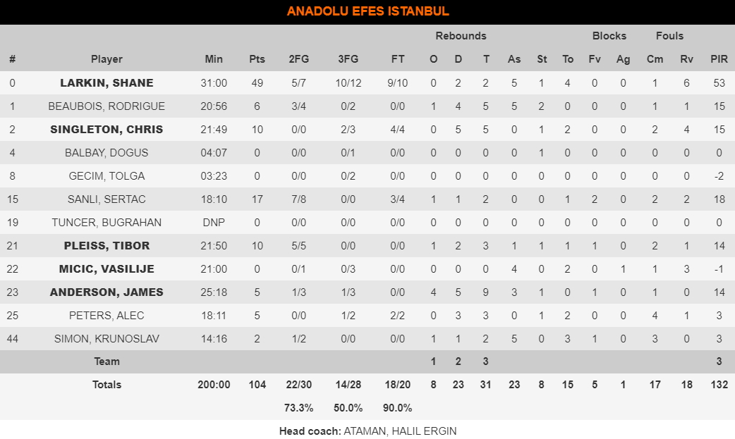 Το μόνο που είχε αξία στο φινάλε ήταν το που θα σταματήσει ο Λάρκιν: ο «δαιμονισμένος» παίκτης της Εφές έσπασε όλα τα… κοντέρ και με τρομερές εκτελέσεις, ολοκλήρωσε τον αγώνα με 49 πόντους και 10/12 τρίποντα γνωρίζοντας την αποθέωση από όλους! Το τελικό σκορ (104-75) μικρή σημασία έχει μετά από όλα αυτά...