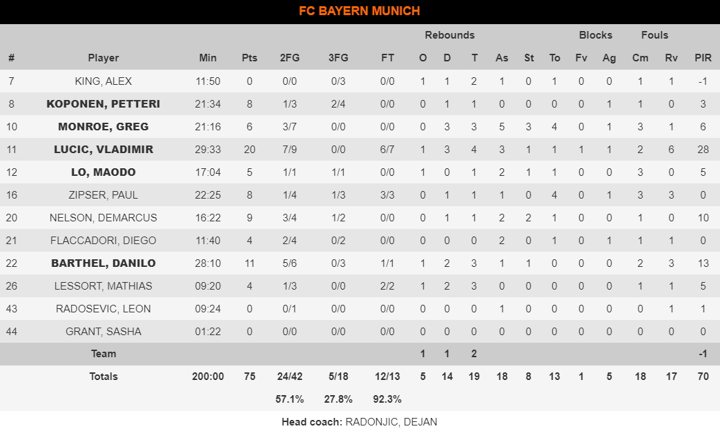 Από την άλλη, για τους Βαυαρούς, που υποχώρησαν στο 4-7, διασώθηκαν οι Λούτσιτς (20 πόντοι) και Μπάρτελ (11 πόντοι).