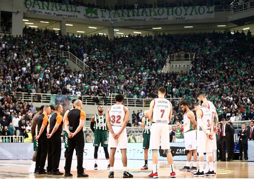 Περίπου 15.000 φίλοι του Παναθηναϊκού απέτισαν με τον δικό τους τρόπο φόρο τιμής στον Θανάση Γιαννακόπουλο. Στα πρώτα λεπτά της αναμέτρησης με την Μπασκόνια ένα και μόνο σύνθημα δονούσε την ατμόσφαιρα, αφιερωμένο στον ιστορικό διοικητικό ηγέτη της ομάδας που έφυγε από τη ζωή τα ξημερώματα της Τρίτης.