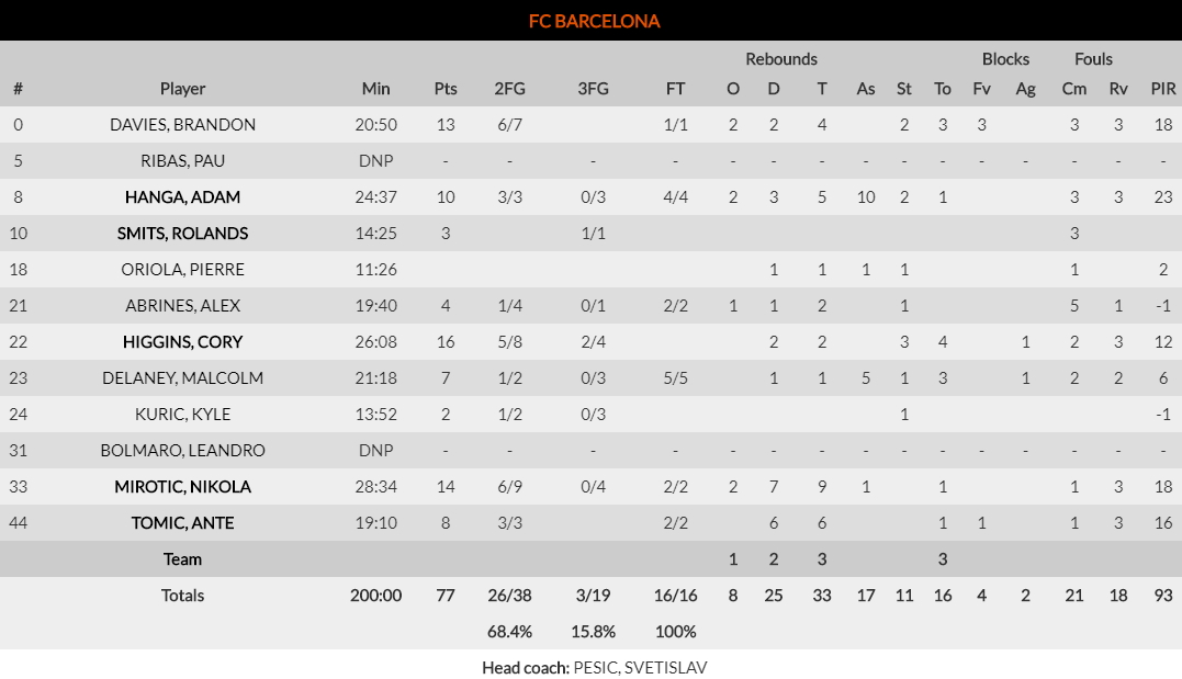 Κορυφαίοι για τους Καταλανούς -που ανέβηκαν στο 12-3- οι Χίγκινς (16 πόντοι), Μίροτιτς (14 πόντοι, 9 ριμπάουντ), Ντέιβις (13 πόντοι) και Χάνγκα (10 πόντοι, 10 ασίστ).