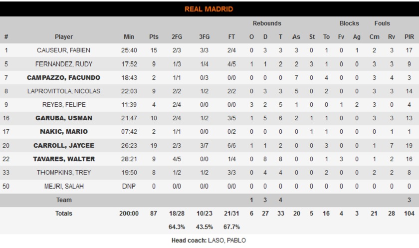 Με μπροστάρη τον Γκαρούμπα, η Ρεάλ πήγε στο +9 (74-65) στην αρχή του τέταρτου δεκαλέπτου, με τον Μαλεντόν να απαντά και τη Βιλερμπάν να πλησιάζει (76-71), στο 34’. Στη συνέχεια, οι παίκτες του Λάσο έσφιξαν αμυντικά για το +10 (83-73) και συντηρώντας τη διαφορά ασφαλείας μέχρι τη λήξη, έφτασαν στη νίκη με το τελικό 87-78.