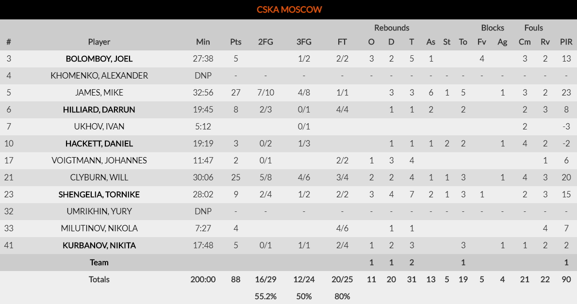 Κάπου εκεί πήραν μπρος οι Κλάιμπερν και Τζέιμς, που οδήγησαν την ομάδα της Μόσχας σε επιμέρους σκορ 15-5 και στο +6 (45-39 στο 18’). Το ημίχρονο έκλεισε με τους Ρώσους να έχουν εξαιρετικά ποσοστά ευστοχίας (9/11 δίποντα, 9/12 τρίποντα), τα οποία τους έφεραν στο +4 (51-47).