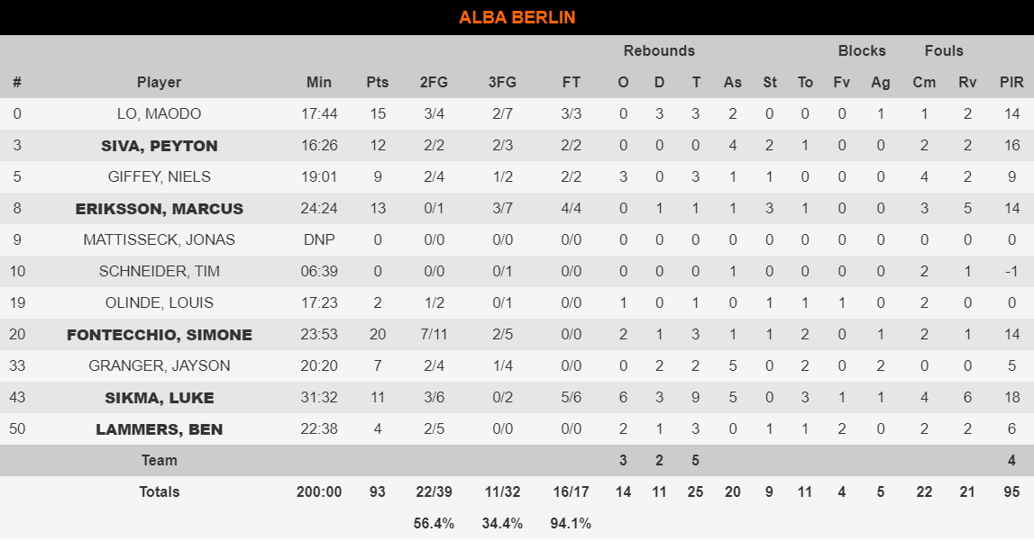Πρωταγωνιστές για τους Γερμανούς, που πανηγύρισαν το πρώτο ροζ φύλλο αγώνα την τρέχουσα σεζόν, οι Φοντέκιο (20 πόντοι), Σίκμα (11 πόντοι, 9 ριμπάουντ, 5 ασίστ) και Λο (15 πόντοι).
