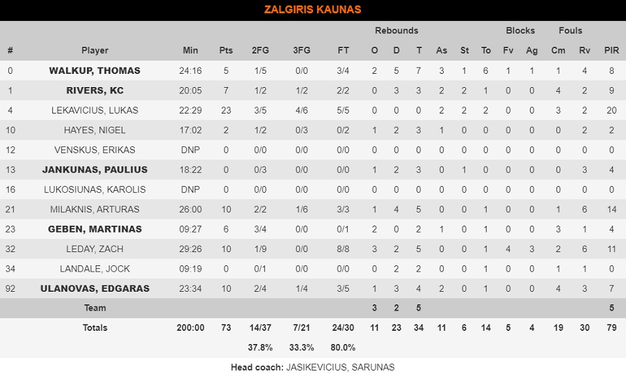 Zαλγκίρις Κάουνας (Γιασικεβίτσιους): Ουάλκουπ 5, Ρίβερς 7, Λεκαβίτσιους 23 (3/5 δίποντα, 4/6 τρίποντα, 5/5 βολές), Χέιζ 2, Γιανκούνας, Μιλάκνις 10, Γκέμπεν 6, ΛεΝτέι 10, Λαντέιλ, Ουλανόβας 10.