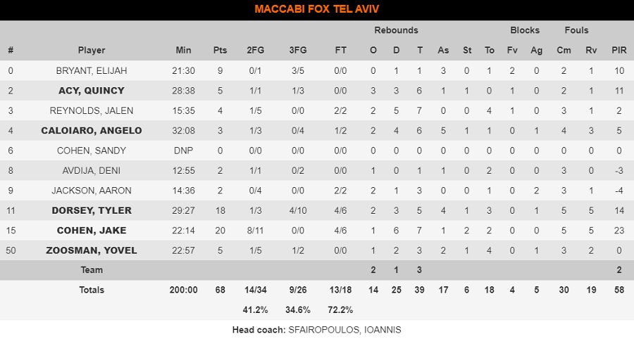 Μακάμπι Τελ Αβίβ (Σφαιρόπουλος): Μπράιαντ 9, Έισι 5, Ρέινολντς 4, Καλοϊάρο 3, Αβντίγια 2, Τζάκσον 2, Ντόρσεϊ 18, Τζέικ Κοέν 20, Ζούσμαν 5.