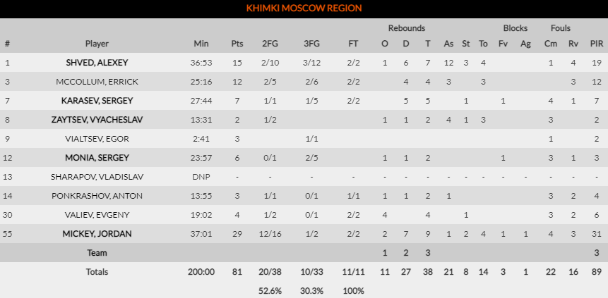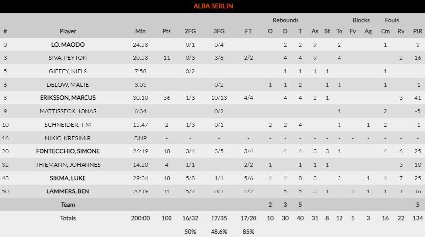 Την ηγετική τριάδα για τους νικητές αποτέλεσαν ο μπόμπερ Μάρκους Έρικσον (36 πόντοι με 10/13 τρίποντα), ο Λουκ Σίκμα (18 πόντοι, 8 ριμπάουντ) και ο Σιμόνε Φοντέκιο (18 πόντοι), ενώ οι Σίβα και Λο είχαν από 9 ασίστ έκαστος. Όλα τα λεφτά για την Χίμκι ο Τζόρνταν Μίκι (season high με 29 πόντους, 9 ριμπάουντ), ακολούθησε σε απόδοση ο Αλεξέι Σβεντ που έφτασε κοντά στο triple double, αλλά με 5/22 σουτ (15 πόντοι, 12 ασίστ, 7 ριμπάουντ),