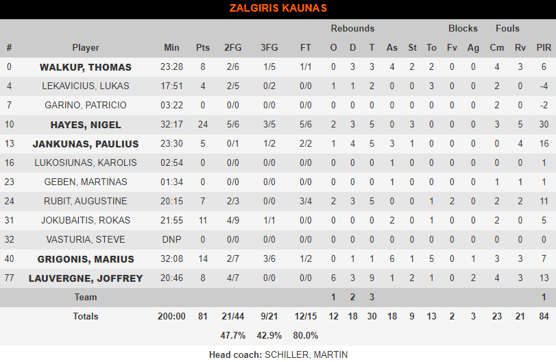 Η ομάδα του Γιάννη Σφαιρόπουλου (12-17) είχε πέντε παίκτες με διψήφιο αριθμό πόντων με κορυφαίο τον Ντράγκαν Μπέντερ (16π.), ενώ για τους Λιθουανούς (15-16) «κουβάλησε» επιθετικά ο Νάιτζελ Χέις με 24 πόντους.