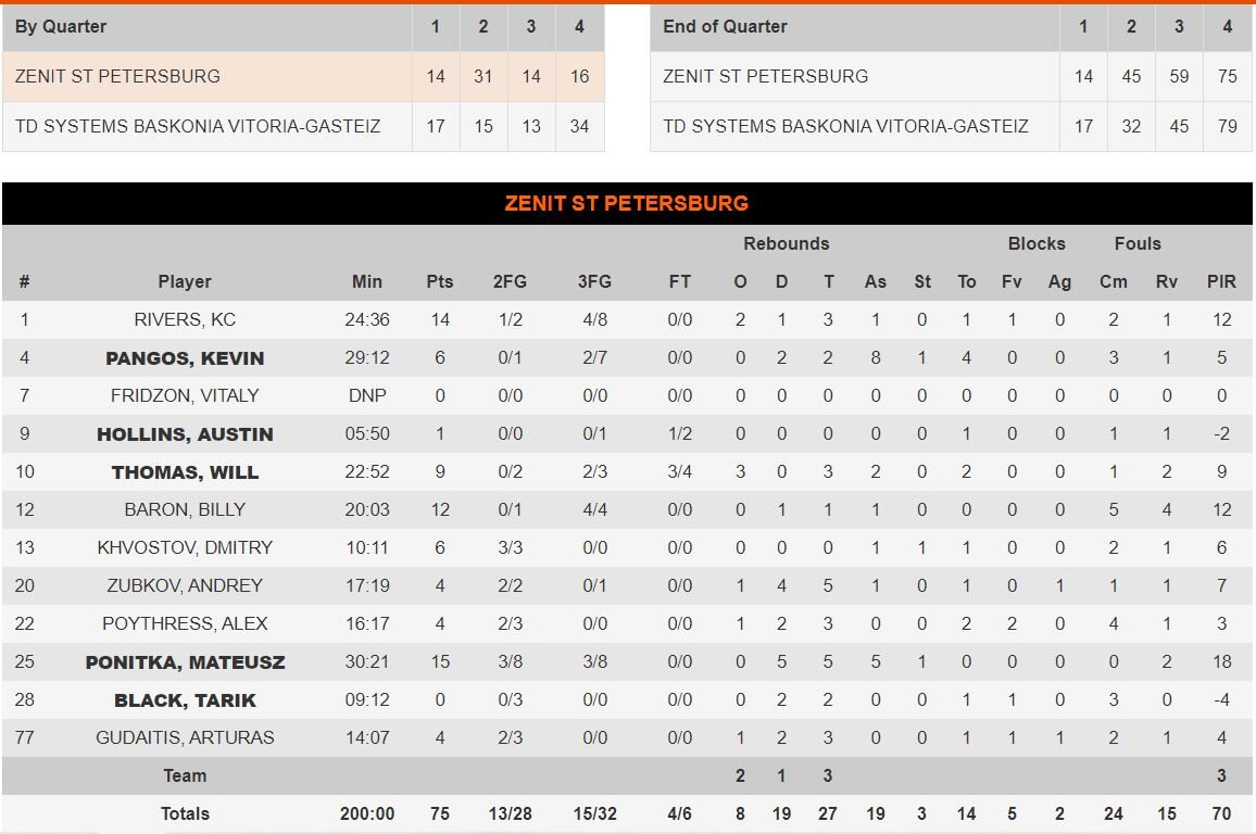 Ανατροπή με… cojones από την Μπασκόνια μέσα στην Αγία Πετρούπολη επί της Ζενίτ, καθώς επικράτησε 79-75, αν και βρέθηκε πίσω μέχρι και με 18 πόντους διαφορά (59-41) και με 14 στα 4’40’’ (72-58) πριν από τη λήξη, πραγματοποιώντας σερί 19-0 στα τελευταία λεπτά.