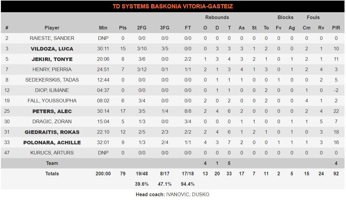 Κορυφαίος για τους Βάσκους ο Πίτερς με 17 πόντους, ενώ κρίσιμος ήταν ο Βιλντόζα (15 π.) που πέτυχε ένα κρίσιμο τρίποντο, που «σφράγισε» τη μεγάλη ανατροπή, που βάζει πλέον την Μπασκόνια πολύ γερά στο κόλπο της οχτάδας, αφού ανέβηκε στο 16-14.