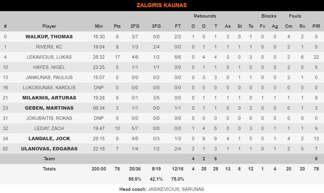 Μεγάλος πρωταγωνιστής για τους Λιθουανούς ο Λούκας Λεκαβίτσιους, ο οποίος είχε 17 πόντους, 4 ριμπάουντ και 3 ασίστ. Στο 6-13 ανέβηκε η ομάδα του Γιασικεβίτσιους, που ανέτρεψε και τη διαφορά με την οποία είχε χάσει στο αντίστοιχο ματς του πρώτου γύρου.