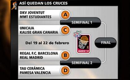 Ένα πολύ σπουδαίο ντέρμπι ανέδειξε η κλήρωση για το Final 8 του Κυπέλλου Ισπανίας. Η Ρεάλ Μαδρίτης θα αναμετρηθεί με την Μπαρτσελόνα, ενώ η ομάδα που θα… επιβιώσει θα βρει στο δρόμο της το νικητή του Τάου Κεράμικα-Παμέσα Βαλένθια. Η Μπανταλόνα θα κοντραριστεί με την Εστουντιάντες και η Ουνικάχα Μάλαγα με τη Γκραν Κανάρια. Ο πρώτος τίτλος της χρονιάς στην Ισπανία θα κριθεί το τετραήμερο 19-22 Φεβρουαρίου στη Μαδρίτη (Palacio de Deportes).