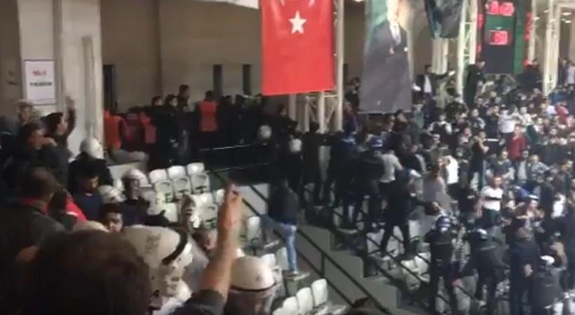 Στο 1:50 πριν το τέλος της πρώτης περιόδου και με το σκορ στο 19-20, οπαδοί των δύο ομάδων άρχισαν να ανταλλάσσουν αντικείμενα στις κερκίδες. Οι διαιτητές αποφάσισαν να διακόψουν το ματς, αποσύρθηκαν στα αποδυτήρια και μόνο όταν αποκαταστάθηκε η τάξη επέστρεψαν στο παρκέ για τη συνέχεια.