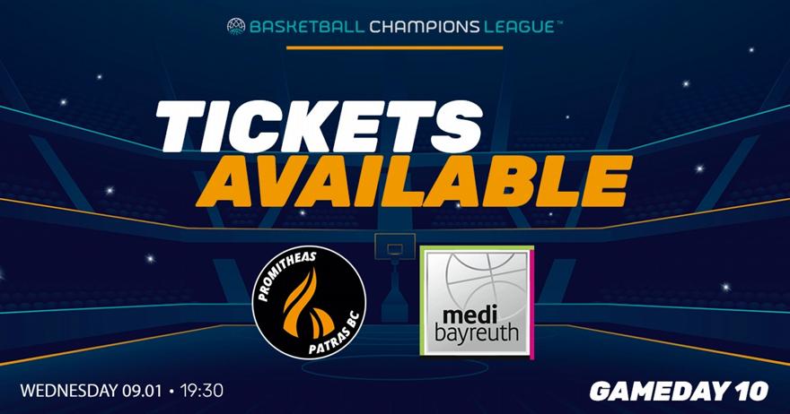 O Ευρωπαίος Προμηθέας επιστρέφει στην δράση για την καθοριστική μάχη της 10ης αγωνιστικής του Basketball Champions League κόντρα στην medi Bayreuth, σ' ένα παιχνίδι που η νίκη απέναντι στη γερμανική ομάδα ισοδυναμεί με αποφασιστικό βήμα για την πρόκριση στην επόμενη φάση του BCL. Ο αγώνας θα διεξαχθεί την Τρίτη 13 Ιανουαρίου, στην κεντρική σάλα του «Δημ. Τόφαλος», με ώρα έναρξης τις 19:30 και οι φίλοι του Προμηθέα μπορούν να προμηθεύονται τα εισιτήρια της αναμέτρησης ηλεκτρονικά μέσω της Viva ή καθημερινά 09:00-18:00 από τα γραφεία της ΚΑΕ (Κανακάρη 136, 5ος όροφος, τηλ: 2610 275820).
