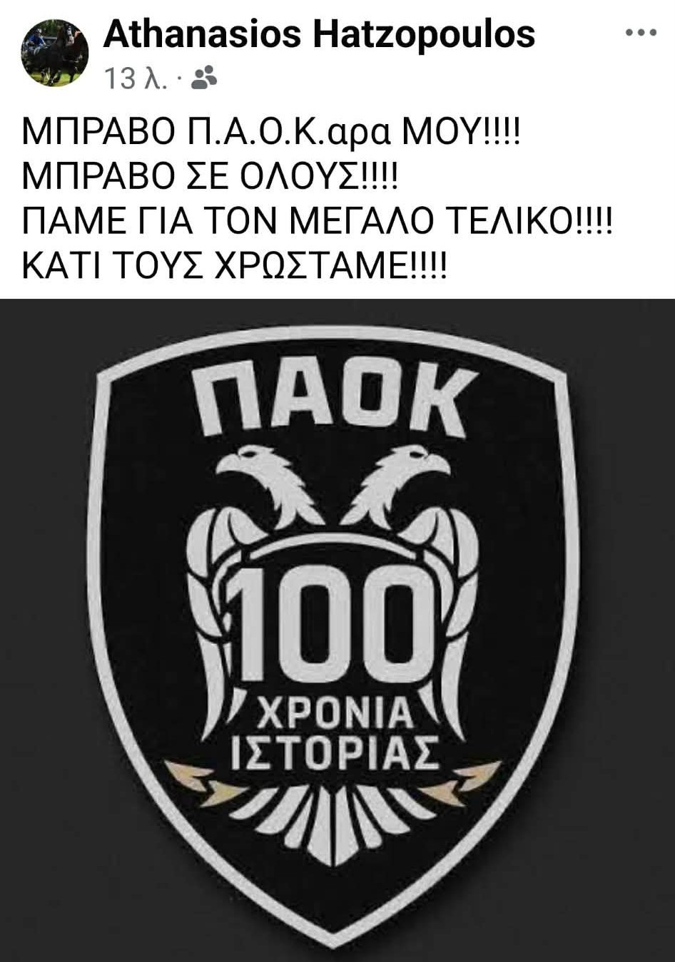 «Μπράβο ΠΑΟΚάρα μου, μπράβο σε όλους. Πάμε για τον μεγάλο τελικό, κάτι τους χρωστάμε...», ανέφερε στο μήνυμά του.