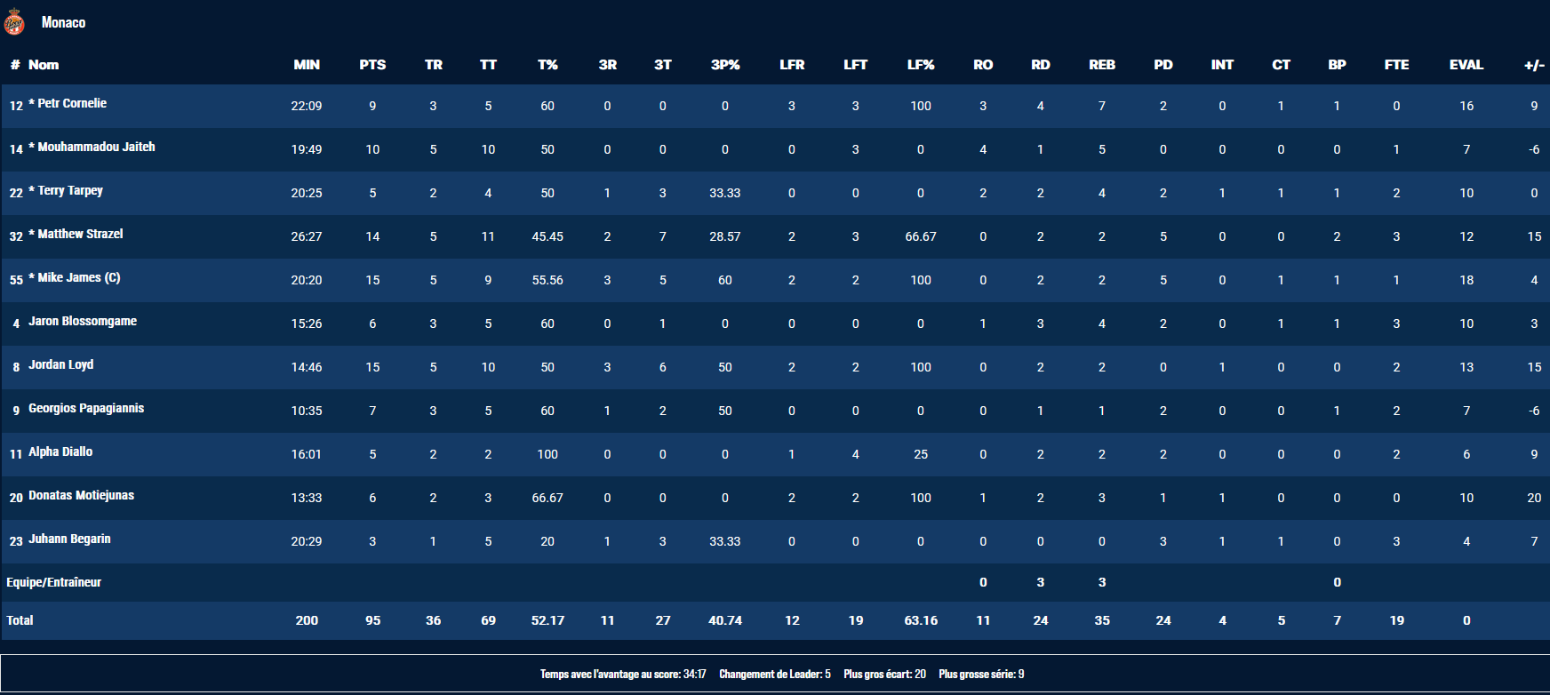 Κορυφαίος του αγώνα ήταν ο Μάικ Τζέιμς, ο οποίος ολοκλήρωσε την αναμέτρηση με 15 πόντους, 5 ασίστ και 2 ριμπάουντ. Καλή παρουσία με 15 πόντους και για τον Τζόρνταν Λόιντ, ενώ 14 μέτρησε ο Ματιέ Στραζέλ και 10 ο Μαμ Ζαϊτέ.