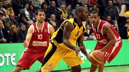 Οι «κίτρινοι» μπήκαν σαφώς πιο δυνατά στο παρκέ και, εκμεταλλευόμενοι τα λάθη των «ερυθρόλευκων» στις ασίστ και την αστοχία τους κάτω από το αντίπαλο καλάθι, κατάφεραν να προηγηθούν με 12 πόντους. Ο «δράκος» «έριξε» στο παρκέ τους Βούισιτς και Παπαλουκά, που δεν τους είχε ξεκινήσει στον αγώνα και, έτσι, οι φιλοξενούμενοι κατάφεραν να μειώσουν στους εφτά, με τη λήξη του πρώτου δεκάλεπτου. Στη δεύτερη περίοδο, οι Πειραιώτες έδειξαν πως είναι ανώτερη ομάδα και έκαναν ένα σερί 6-0, μειώνοντας στους τρεις πόντους. Όμως, έμειναν εκεί, αφού οι παίκτες του Σούλη Μαρκόπουλου "δημιούργησαν" ένα δικό τους σερί και ξέφυγαν ξανά με εννιά. Ο Ολυμπιακός βρήκε πάλι τις λύσεις, λόγω της εμπειρίας των παικτών του και μείωσε στους τρεις. Τελικά, το ημίχρονο ολοκληρώθηκε στο +6 για τους γηπεδούχους.