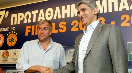 Με κοινό στόχο την κατάκτηση του πρωταθλήματος και ευχή για όμορφο θέαμα χωρίς επεισόδια, παρουσιάστηκαν οι δύο μεγάλοι φιναλίστ των τελικών της Α1 μπάσκετ στη συνέντευξη Τύπου, που έγινε σε κεντρικό ξενοδοχείο της Αθήνας. «Να παίξουμε καλό μπάσκετ και να πάρουμε το πρωτάθλημα», τόνισε ο προπονητής του Ολυμπιακού, Παναγιώτης Γιαννάκης. «Φέτος μπορούμε να το πετύχουμε», δήλωσε ο αρχηγός, Θοδωρής Παπαλουκάς. «Ξεχνάμε τα πάντα, ό,τι πετύχαμε μέχρι τώρα. Δεν υπάρχει για μας Ευρωλίγκα και Κύπελλο. Θέλουμε το πρωτάθλημα», το κοινό μήνυμα των Ζέλικο Ομπράντοβιτς και Φραγκίσκου Αλβέρτη, από πλευράς Παναθηναϊκού.