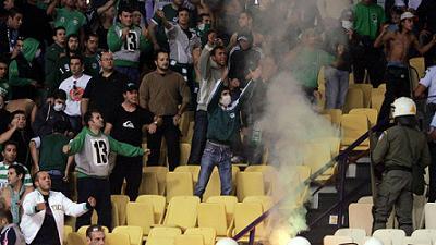 "Πράσινοι" και "ερυθρόλευκοι" οπαδοί... κατέλαβαν τα επίσημα και ο καρεκλοπόλεμος έδινε κι έπαιρνε. Οι φιλοξενούμενοι "πλακώθηκαν" με τους αστυνομικούς, ενώ ακόμη και πυροσβεστήρες βρέθηκαν στο παρκέ! Δυστυχώς, οι ανεγκέφαλοι έκαναν και πάλι την εμφάνιση τους.