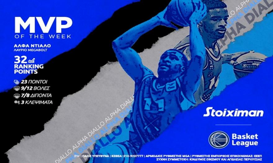 «Το Λαύριο Megabolt νίκησε για πρώτη φορά στην ιστορία του τον Άρη στο Αλεξάνδρειο και Stoiximan MVP of the Week αναδείχθηκε ο πρωταγωνιστής της επικράτησης του, Άλφα Ντιαλό. Ο 23χρονος Αμερικανός φόργουορντ συγκέντρωσε 32 βαθμούς στο ranking περισσότερους από κάθε άλλο παίκτη νικήτριας ομάδας την εβδομάδα που πέρασε. Ο Ντιαλό στη νίκη της ομάδας της Λαυρεωτικής στην Θεσσαλονίκη είχε 23 πόντους με 9/12 βολές, 7/8 δίποντα, 0/1 τρίποντο, 4 ριμπάουντ, μια ασίστ, ένα κόψιμο, 10 κερδισμένα φάουλ, δύο φάουλ εναντίον, δύο κλεψίματα, δύο λάθη σε 30’ και 54’’ συμμετοχής».