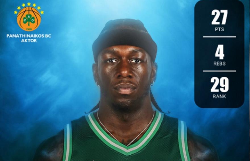 Στη νίκη του Παναθηναϊκού AKTOR στο Περιστέρι, ο Αμερικανός γκαρντ είχε 27 πόντους (6/9 δίποντα, 5/6 τρίποντα), 4 ριμπάουντ, 3 ασίστ και 1 τάπα σε 28 λεπτά, συγκεντρώνοντας 29 μονάδες στο σύστημα αξιολόγησης.