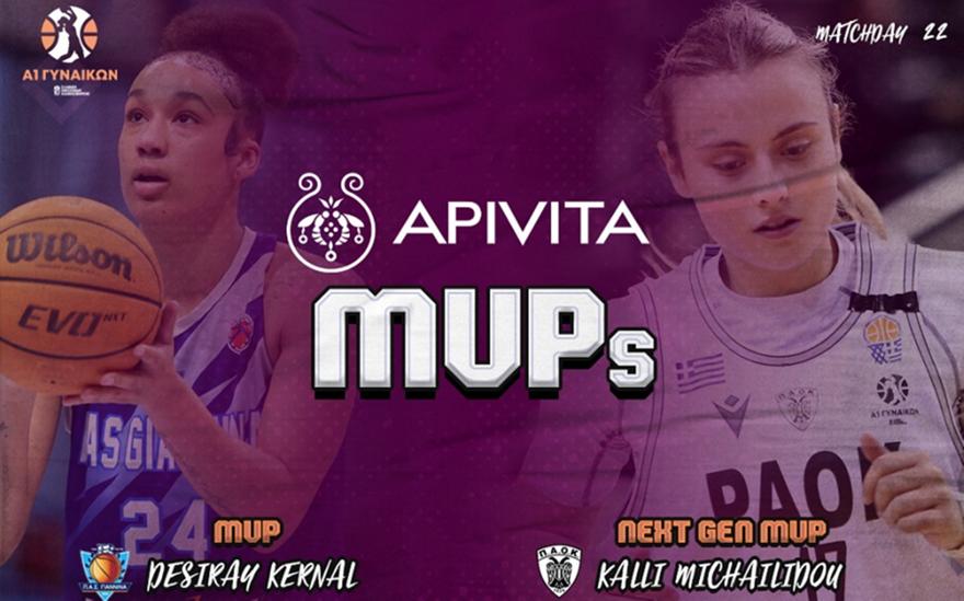 H Ντιόν Κέρναλ του ΠΑΣ Γιάννινα αναδείχθηκε Apivita MVP της 22ης Αγωνιστικής (για δεύτερη φορά στο φετινό πρωτάθλημα) και την Κάλι Μιχαηλίδου του ΠΑΟΚ να κερδίζει τον τίτλο της Apivita MVP Next Gen.