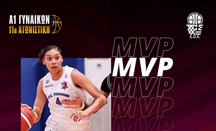 Η Τέρεϊ Μπριγκς του ΠΑΣ Γιάννινααναδείχθηκε MVP της 11ης αγωνιστικής του πρωταθλήματος της Α1 Γυναικών. Η 25χρονη σέντερ στη νίκη της ομάδας της με 86-55 επί του ΟΑ Χανίων είχε 17 πόντους, 10 ριμπάουντ, 8 ασίστ, ένα κλέψιμο, δύο κοψίματα σε 33’22’’ και έφτασε στο 32 στο σύστημα αξιολόγησης.