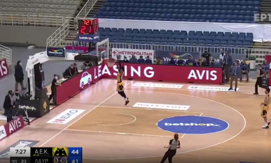 Μέσα από την εξαιρετική άμυνα του Μορέιρα πάνω στον γκαρντ του Λαυρίου Κάρτερ, η ΑΕΚ έκλεψε την μπάλα και βρήκε δύο εύκολους πόντους στο ανοικτό γήπεδο με κάρφωμα Μέικον!