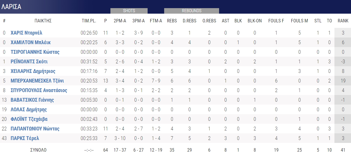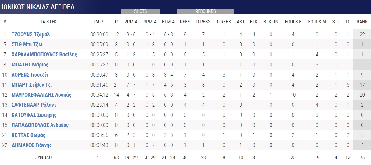 Κορυφαίος για τους γηπεδούχος ο Μπαρτ Τζούνιορ, που σταμάτησε στους 21 πόντους με 7/7 δίποντα. Από… κοντά σε απόδοση οι Μαυροκεφαλίδης (14 πόντοι), Τζόουνς (12 πόντοι, 8 ριμπάουντ).