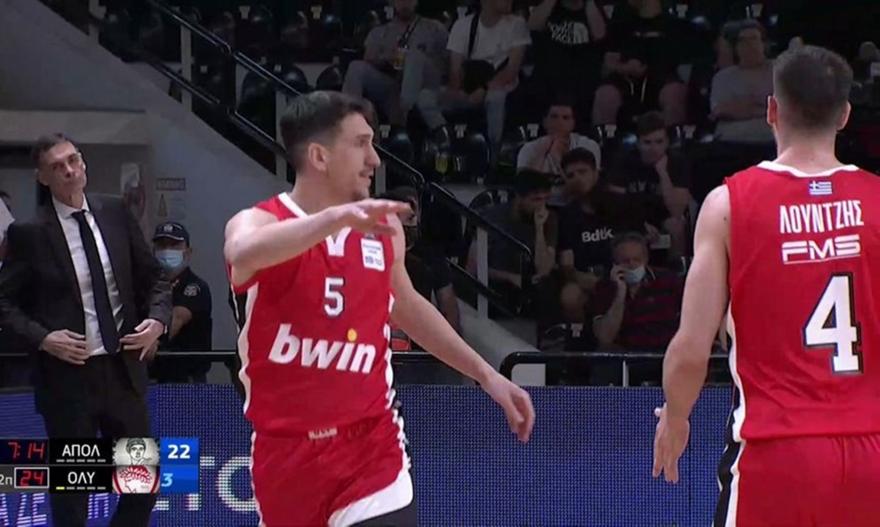 Ο Γιαννούλης Λαρεντζάκης εκτέλεσε εύστοχα ένα τρίποντο, ενώ στη συνέχεια πέτυχε το lay up, κερδίζοντας και βολή, την οποία έβαλε και έτσι πέτυχε έμμεσο τρίποντο κόντρα στον Απόλλωνα.