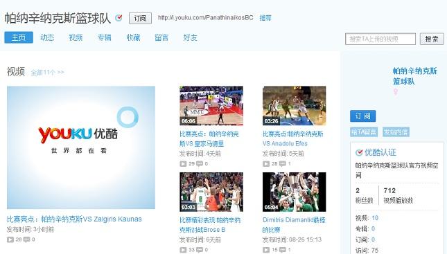 Πρόκειται για το Youku (http://i.youku.com/PanathinaikosBC) όπου προβάλλονται αγώνες, φάσεις και highlights της ομάδας.