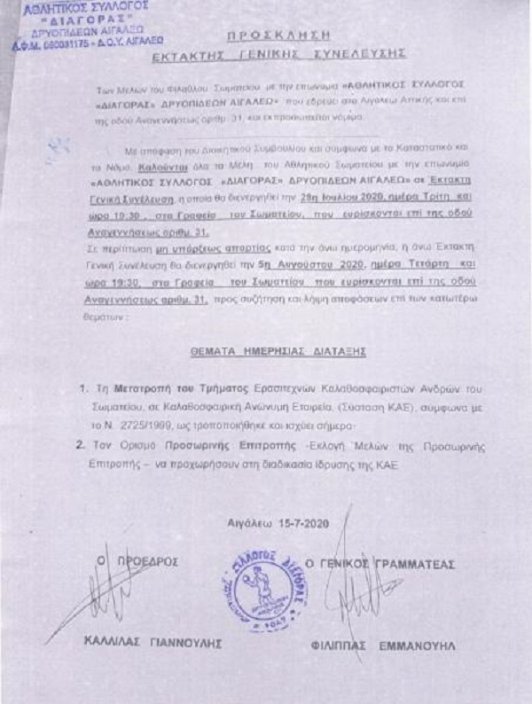 «ΠΡΟΣΚΛΗΣΗ ΕΚΤΑΚΤΗΣ ΓΕΝΙΚΗΣ ΣΥΝΕΛΕΥΣΗΣ των μελών του Φίλαθλου Σωματείου με την επωνυμία ΑΘΛΗΤΙΚΟΣ ΣΥΛΛΟΓΟΣ ΔΙΑΓΟΡΑΣ ΔΡΥΟΠΙΔΕΩΝ ΑΙΓΑΛΕΩ, που εδρεύει στο Αιγάλεω Αττικής και επί της οδού Αναγεννήσεως αριθμός 31 και εκπροσωπείται νόμιμα.