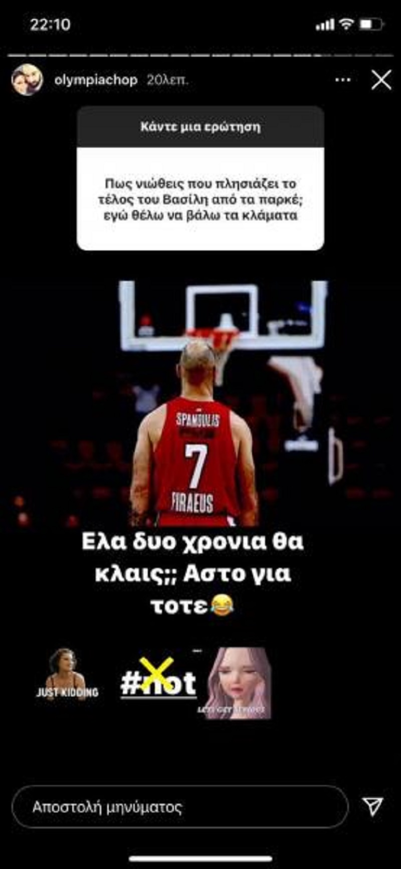 Την… αποκάλυψη αναφορικά με το μέλλον του Βασίλη Σπανούλη περίμεναν από την Ολυμπία Χοψονίδου οι ακόλουθοί της στο Instagram.