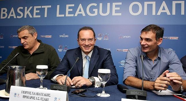 Τον λόγο πήρε στην αρχή της συνέντευξης ο πρόεδρος του ΕΣΑΚΕ, Γιώργος Χαλβατζάκης, ο οποίος εκ μέρους του Δ.Σ. βράβευσε τον Ολυμπιακό για τη κατάκτηση του Διηπειρωτικού Κυπέλλου. «Το μπάσκετ γυρνάει ξανά στο ενδιαφέρον του Έλληνα, στο πρόσωπο του Γιώργου Μπαρτζώκα βραβεύω τον Ολυμπιακό για την κατάκτηση του Διηπειρωτικό», ήταν τα λόγια του. Στη συνέχεια ο κ. Χαλβατζάκης μίλησε ενόψει της νέας σεζόν: «Ήδη μέτρησα πάνω από 85 φιλικά παιχνίδια προετοιμασίας, ενδιαφέρον πρωτόγνωρο πριν την έναρξη του Πρωταθλήματος. Το φετινό, έχω την αίσθηση ότι θα είναι καλύτερο σε όλα τα επίπεδα. Είμαι σίγουρος ότι ο Παναθηναϊκός και ο Ολυμπιακός θα τα πάνε καλά στην Ευρώπη. Έχουμε ΠΑΟΚ και Πανιώνιο στο ΕuroCup. Όλες οι ομάδες πήραν πιστοποιητικά συμμετοχής, χωρίς κανένα πρόβλημα. Το νέο site E..Σ.Α.Κ.Ε. ήδη έχει ανέβει», τόνισε και συνέχισε: