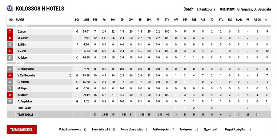 Η ομάδα του Παπανικολόπουλου τελείωσε το ματς με 11/23 τρίποντα, με τους Μπράουν και Σμιθ να ήταν κορυφαίοι, έχοντας 18π. και 16π. αντίστοιχα.