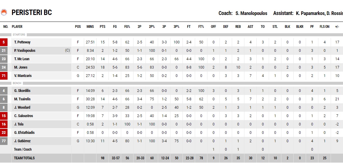 Κορυφαίοι για τους νικητές ήταν οι Τζόουνς (double double με 18π., 10ρ.), Τσαϊρέλης (14π,, 5ρ., 7ασ.), Πετεγουέι (15π.) και Μακλίν (14π.). Για την Λάρισα κορυφαίος ο Παπαδάκης με 22 πόντους (6/10 τρίποντα) και ακολούθησε ο Γουάσινγκτον με 16 πόντους, πλην αυτών όμως δεν διακρίθηκε κανείς.