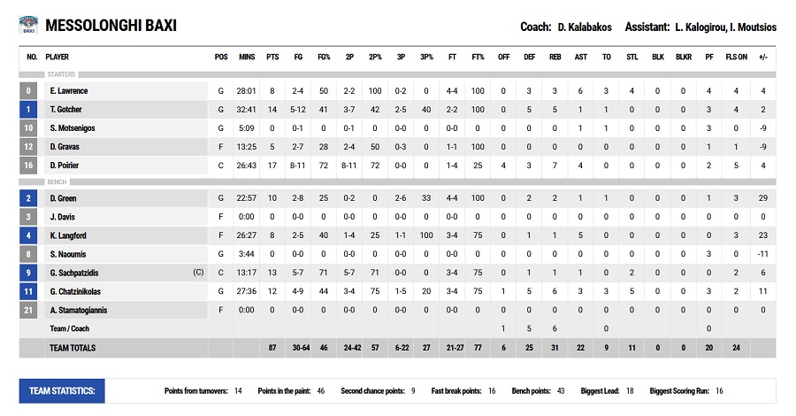Το στατιστικό του αγώνα: Τα 20 λάθη του Κολοσσού Ρόδου και οι 22 ασίστ του Μεσολογγίου.